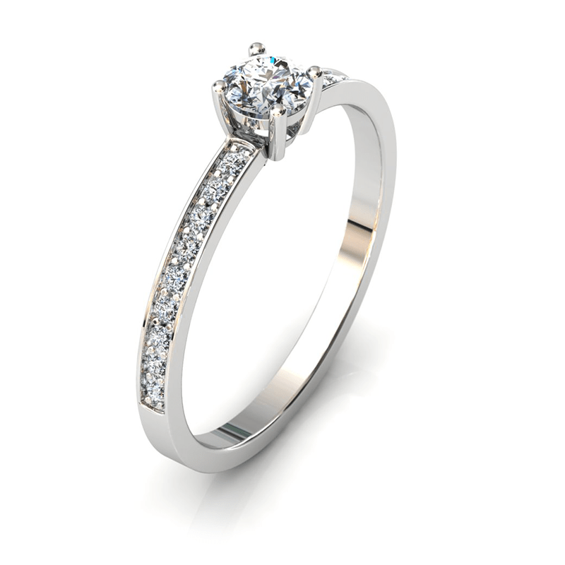 Pour habiller délicatement cette pierre de 0.25 ct, le corps de bague est serti de 18 diamants de qualité G-VS.