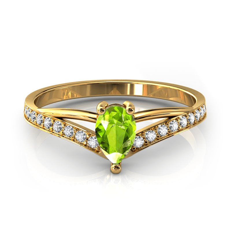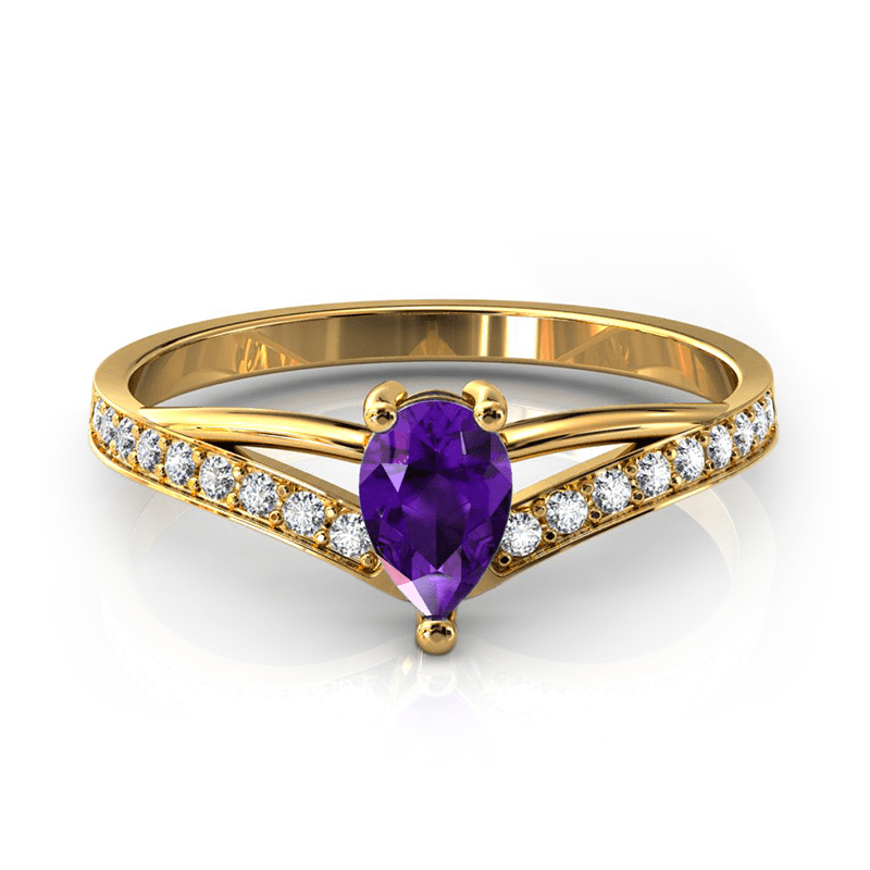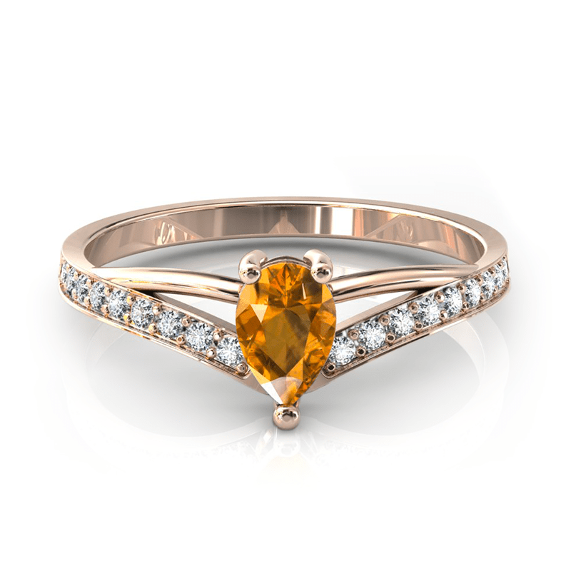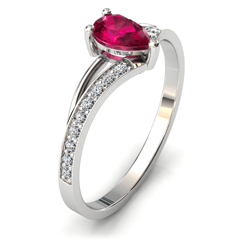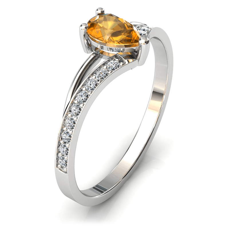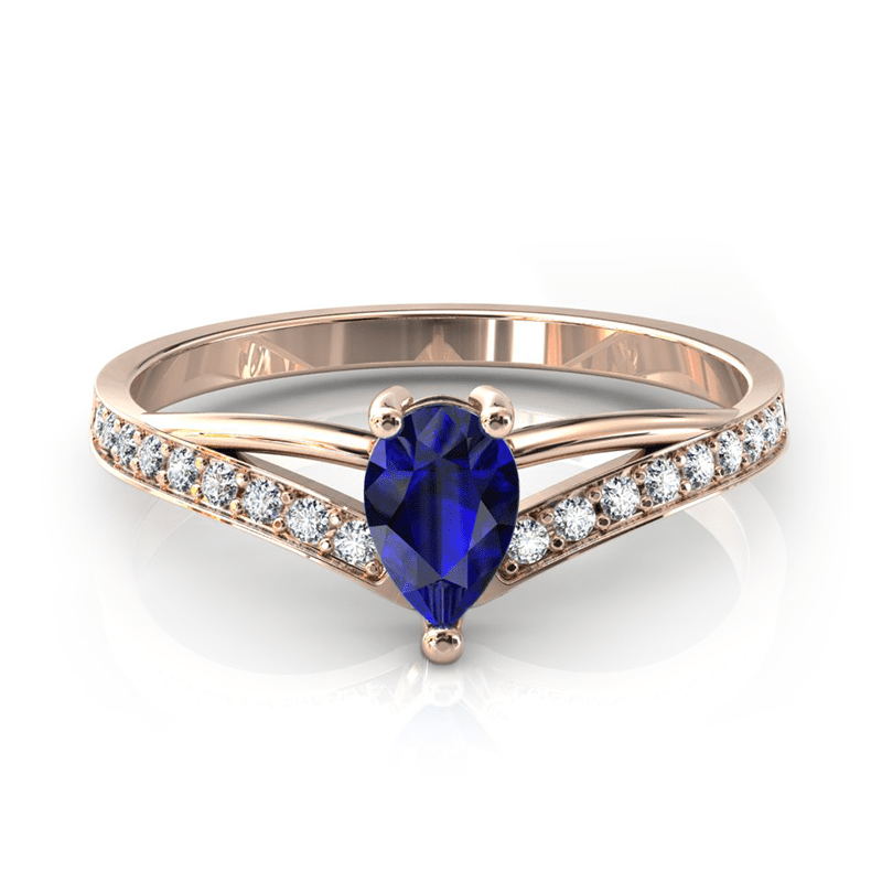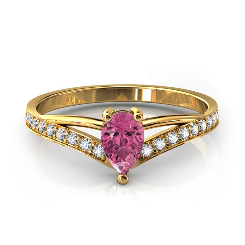 Trois griffes viennent sertir la pierre centrale et 18 diamants de qualité G-VS ornent soigneusement l'anneau pour sublimer davantage la poire.